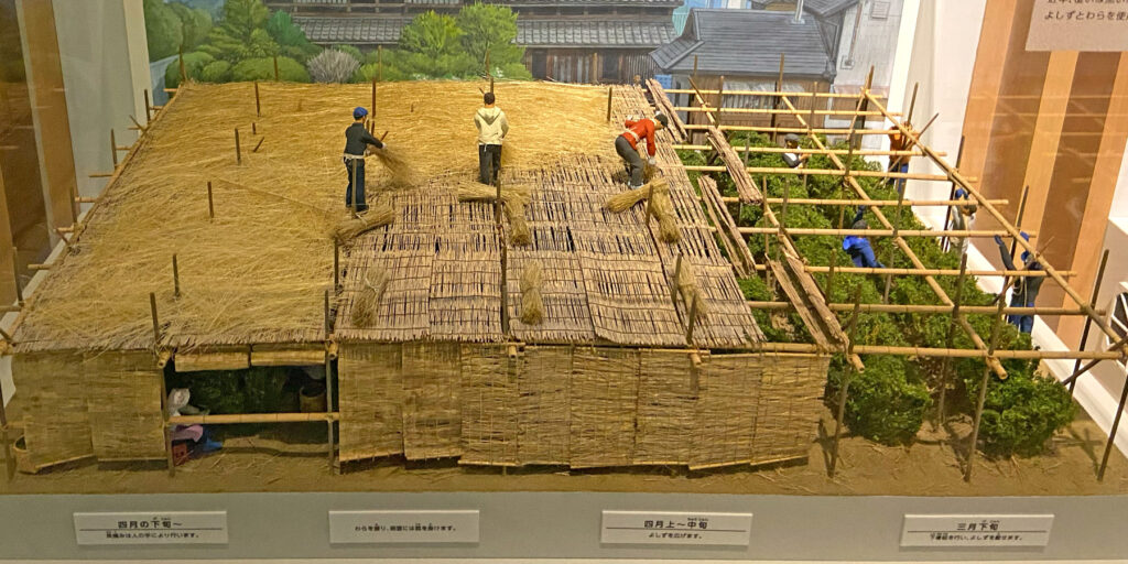 本ず覆下栽培では、まず茶園全体に竹などで枠組みを作り、その上によしずを広げます。さらに藁を均一に振り、茶園の側面を藁で編んだ菰(こも)で囲うのが特徴です。館内に展示されている模型は非常に精巧に作られており、本ず覆下栽培の茶園の構造を詳しく学ぶことができます。