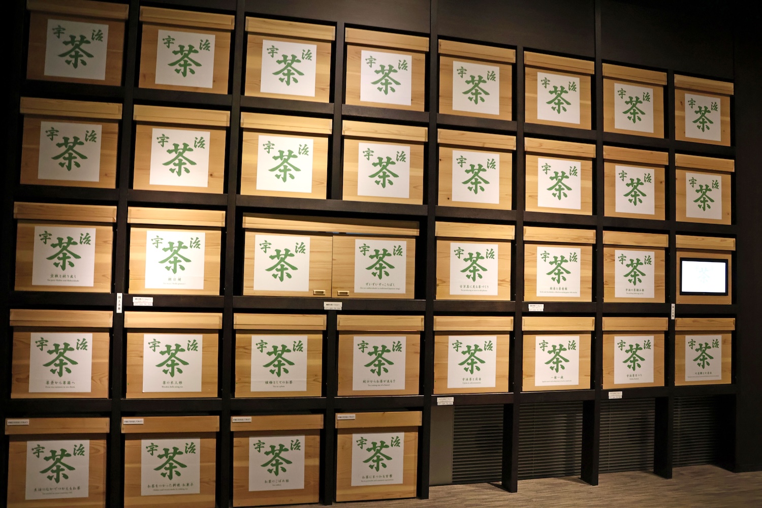 宇治茶の間の最後の展示エリアには、壁一面に並んだたくさんの茶箱。