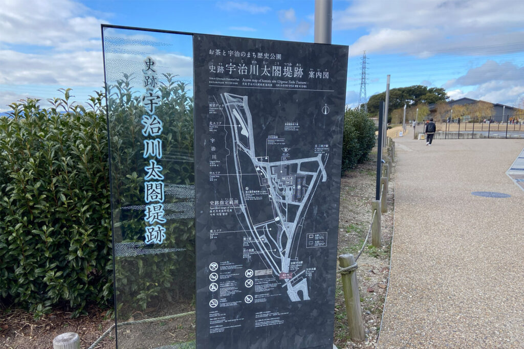 宇治橋から徒歩約5分。宇治川沿いに広がる「お茶と宇治のまち歴史公園」は、史跡宇治川太閤堤跡(たいこうづつみあと)や茶園、広場、庭園、そして交流館を備えた人々の憩いの場です。