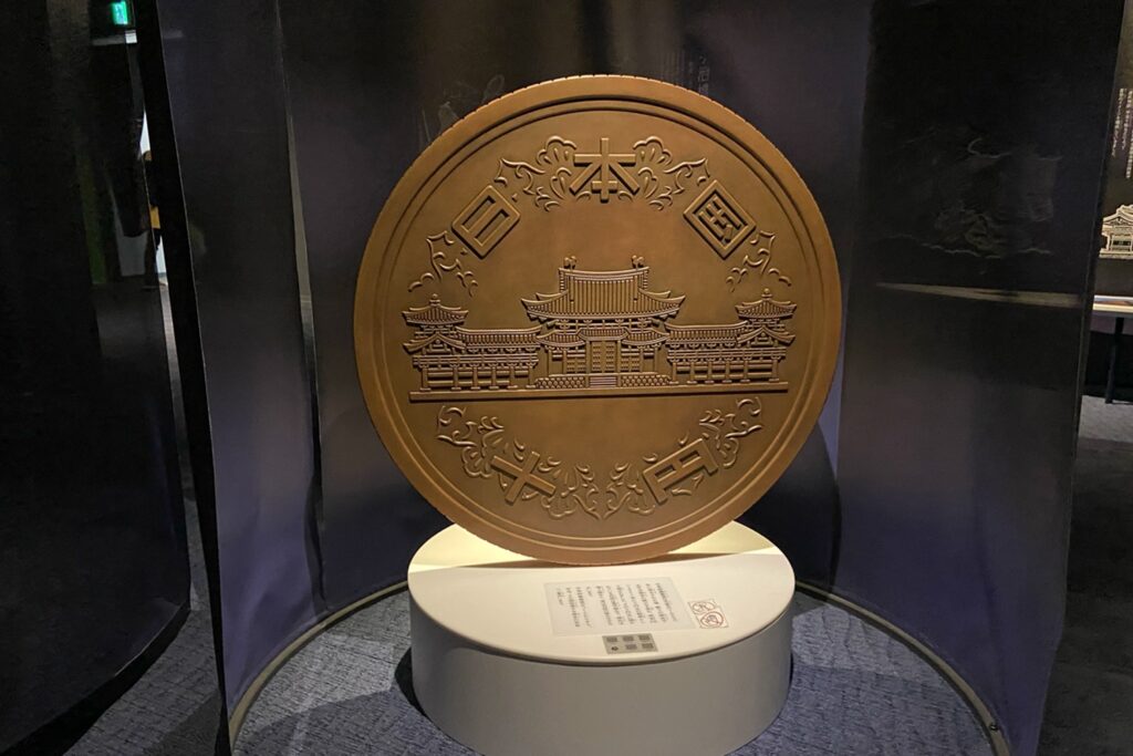 展示の入り口には、宇治の名所である平等院鳳凰堂が描かれている巨大な十円玉が設置されています。