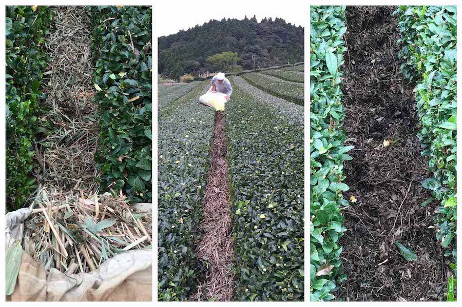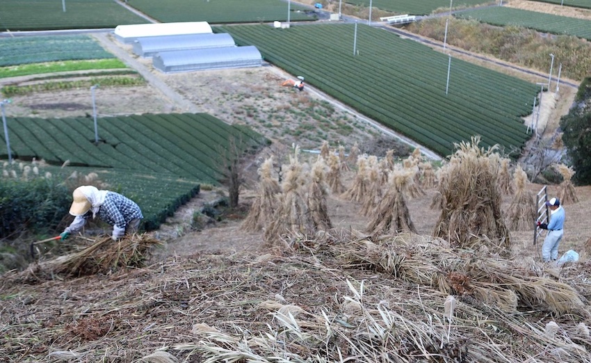 刈り取った茶草を堆肥化させ、夏に籾殻を混ぜ発酵させ、12月から1月に茶畑に散布しているお茶農家もいます。