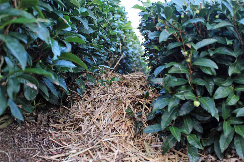 刈ったススキやササは切断機で細かくし茶畑の畝間に敷きます。畝間に敷かれた茶草は、ふわふわで布団のようです。茶草は時間をかけて堆肥になります。また茶草を敷くことで雑草を生えにくくし、土が雨水で流れるのを防ぐ役割も果たしています。
