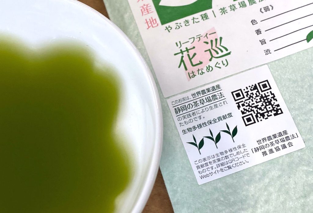 世界農業遺産「静岡の茶草場農法」推進協議会の生物多様性貢献度表示シールは、茶葉のイラストの数で生物多様性保全貢献度を示しています。