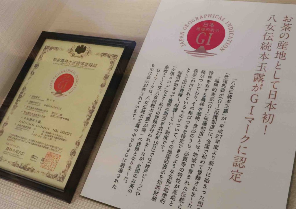 八女伝統本玉露は、地理的表示(GI)保護制度に登録されています。この制度は、伝統的な生産方法や気候・風土など生産地の特性が製品の特性と結びついている場合に、知的財産として保護する制度です。
