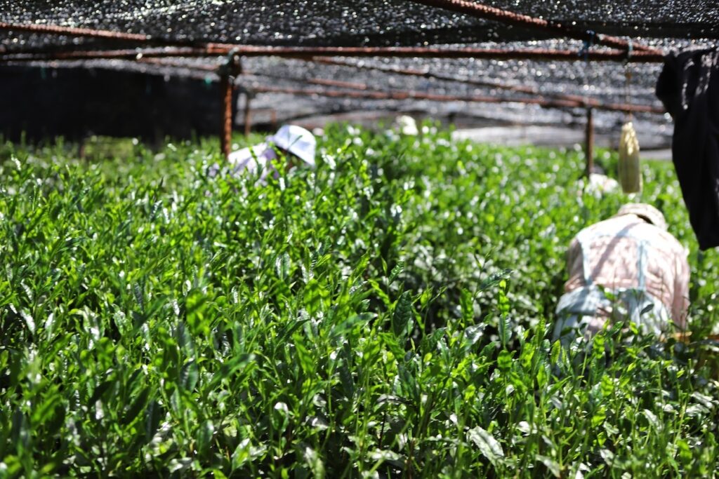 茶園を被覆材で覆い日光を遮断することで、茶葉の苦味成分であるカテキン類の増加が抑えられ、うま味成分のアミノ酸が多くなります。玉露は手摘みしたやわらかい新葉のみを使い製茶します。