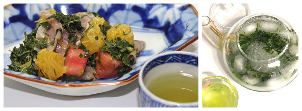 冷蔵庫で一晩かけて氷や冷水で玉露を淹れると、うま味が強く甘味が出ます。茶殻はサラダに使います。