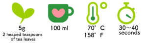 *Tea leaves contain caffeine. The diuretic, stimulant and anticancer effects of caffeine intake are clinically recognized. On the other hand, excessive intake of caffeine may have a damaging effect on health. Especially, pregnant or breastfeeding women, and children should be careful with the amount of caffeine they intake.
